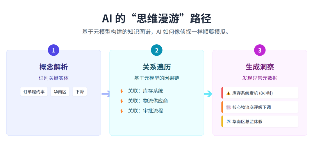 一个没有元模型支撑的AI,最多能告诉你履约率是多少,它无法回答“为什么”。但一个有元模型支撑的AI,它的“思考”过程是这样的: