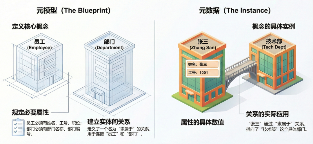 元数据就是具体的记录:“张三”(一个“员工”实例),他的“姓名”是‘张三’,“工号”是‘1001’。他通过“隶属于”这个关系,指向了“技术部”(一个“部门”实例)。
