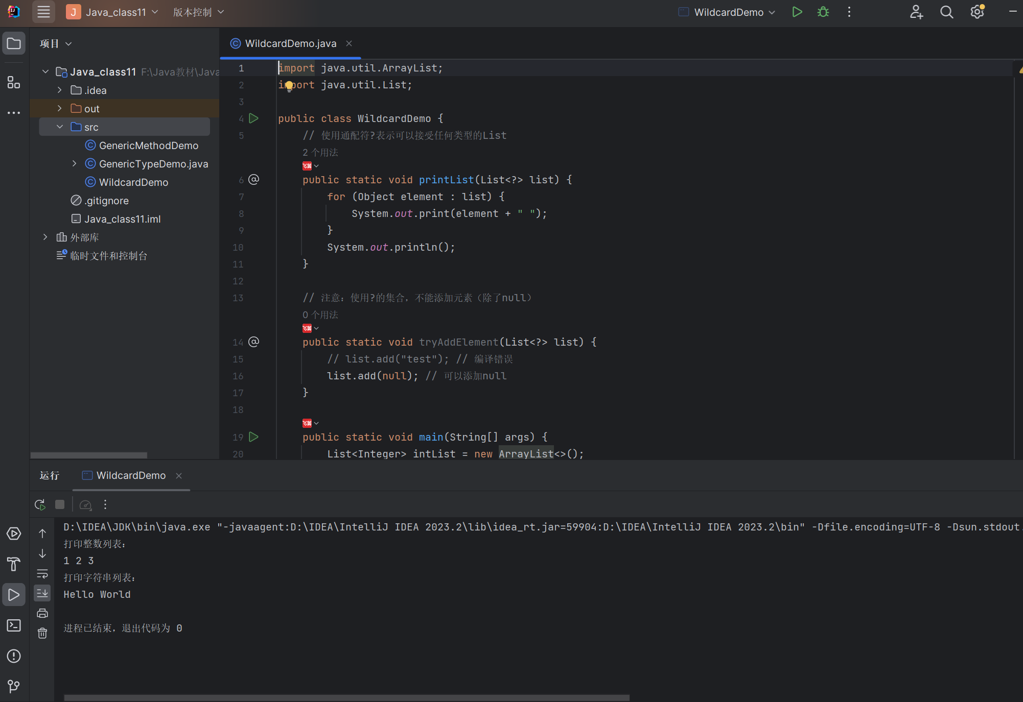 通配符?用于表示未知类型,它可以在声明变量、方法参数和返回值时使用。