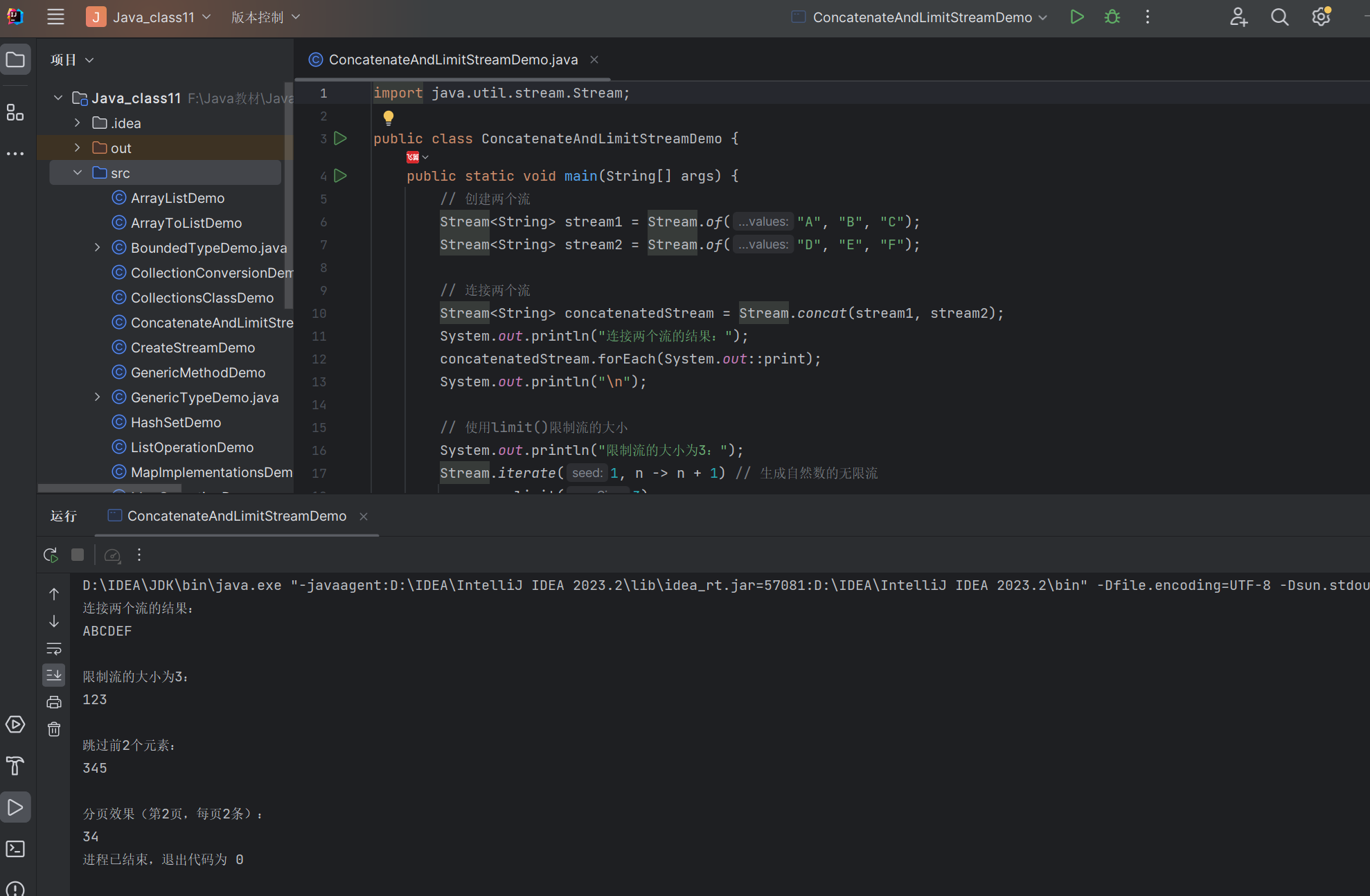 可以使用concat()方法连接两个流,使用limit()方法限制流的大小,使用skip()方法跳过流中的前 n 个元素。