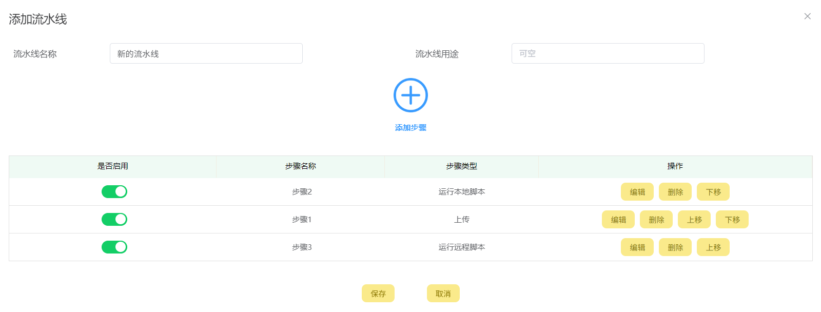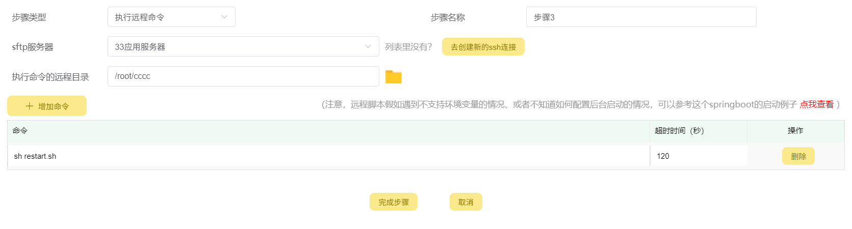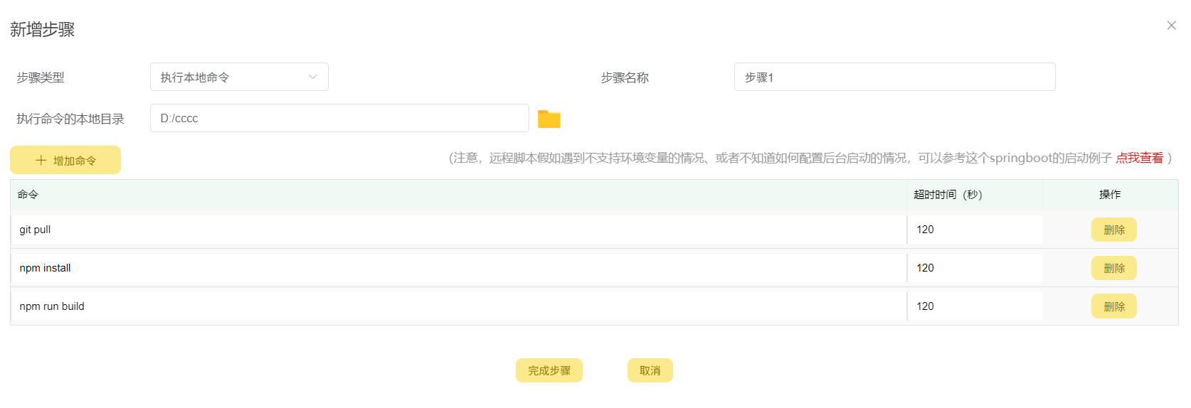 因此,yunedit-ssh将流水线定义为最为关键的三种步骤类型:(1)执行本地命令的步骤,(2)上传文件的步骤,(3)执行远程命令的步骤。在yunedit-ssh上执行命令,不需要像jenkins那样,学习jenkins语法,直接将要执行的命令写在步骤的界面即可。
