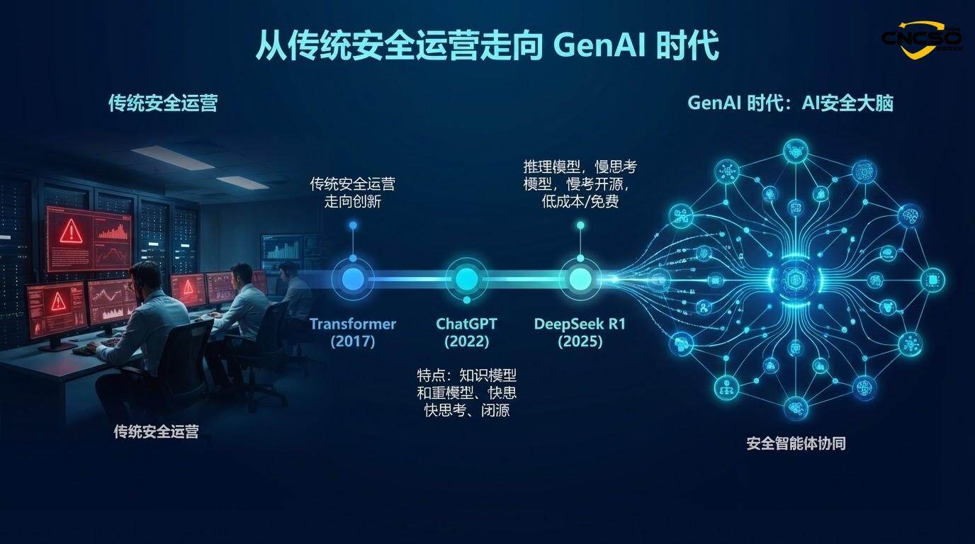 人工智能(AI)正在加速重塑网络安全产业的技术架构与运营范式。从Transformer模型(2017)到ChatGPT的知识表示革命(2018-2024),再到DeepSeek R1通过强化学习与混合专家模型实现成本创新(2025),AI在安全领域的应用已从探索阶段进入规模化落地阶段。