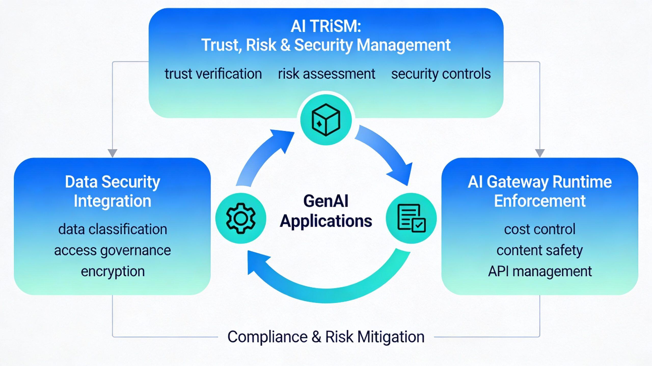 AI TRiSM通过四层技术能力架构——AI治理、AI运行时检查与执行、传统数据保护和隐私保护——确保企业AI应用和模型的行为符合企业意图,同时防御数据泄露、第三方风险和不期望输出[1]。
