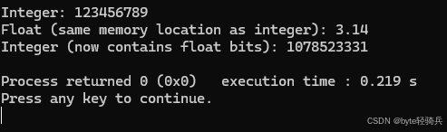 printf("Integer (now contains float bits): %d\n", u.i); // 输出将是浮点数的位模式解释为整数的结果