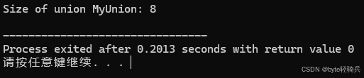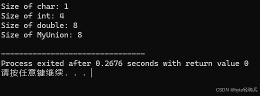 MyUnion联合体包含了char、int和double类型的成员。由于double类型通常比int和char大得多,并且需要更严格的对齐(例如,在许多平台上,double需要对齐到 8 字节边界),因此MyUnion的大小至少是double类型的大小(8 字节)。因 8 字节已满足double的对齐要求,故无额外填充,最终大小为 8 字节。