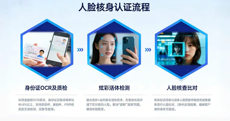 - 权威数据源安全比对:完成前两步后,系统将加密传输所采集的身份证信息与实时活体人脸图像,至公安部相关研究所等国家权威身份数据管理平台进行“1:1”人脸比对。这一过程直接在用户与权威数据库间建立安全通道,比对结果权威可靠,真正实现了“实名”与“实人”的双重校验,确保了身份信息的真实性、有效性及可追溯性。