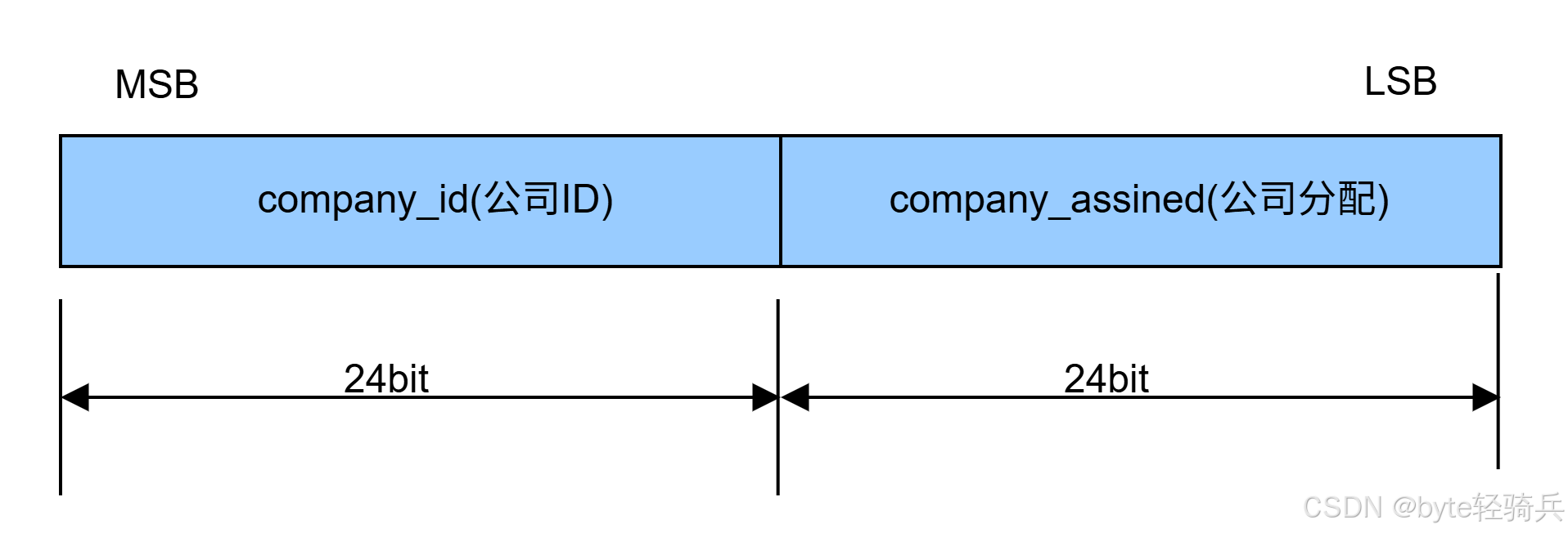 - 组成:48位全部需要向IEEE申请购买。其中,高24位是公司的标识(也称为OUI,Organizationally Unique Identifier),由IEEE进行分配,低24位由制造商为其生产的每个蓝牙设备分配的唯一序列号。