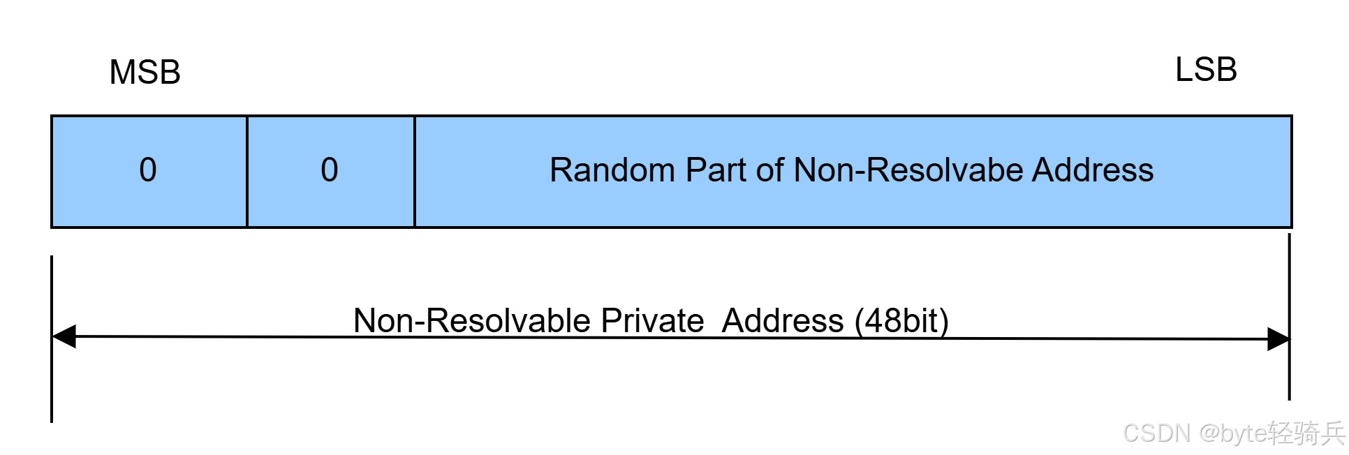 - 地址格式:最高两位bit位被设置为“01”,以区别于其他类型的地址。地址由两部分组成:高位24bits是随机数部分(其中最高两个Bit为"10"),用于标识地址类型;低位24bits是随机数和IRK经过hash运算得到的hash值。