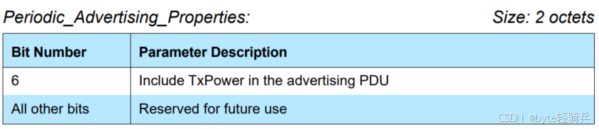 Unknown Advertising Identifier(未知广播标识符),其错误代码值为0x42,表示不支持的功能或参数值。Periodic_Advertising_Properties参数是一个2个字节的字段,用于在周期性广播中指定广播数据包的格式和内容。通过设置不同的位,可以指示是否包含传输功率值以及其他可能的未来功能。这对于确保广播数据包的有效性和兼容性至关重要,并允许设备根据需要进行定制化的广播。
