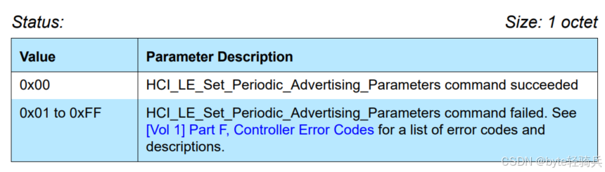 当HCI_LE_Set_Periodic_Advertising_Parameters命令执行完成后,蓝牙控制器将生成一个HCI_Command_Complete事件(Event Code 0x0E),其中包含状态码和广播句柄。如果命令成功执行,状态码为 0x00。如果失败,状态码将指示失败的原因。