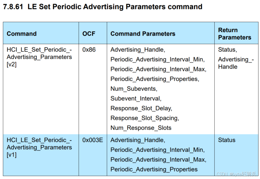 HCI_LE_Set_Periodic_Advertising_Parameters命令用于设置BLE设备的周期性广播参数。该命令通过HCI发送给BLE控制器,以配置设备在周期性广播模式下的行为。周期性广播是一种节能的广播模式,适用于需要持续广播数据但不需要频繁建立连接的应用场景。