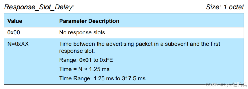 在BLE的周期性广播中,如果广播者希望接收来自扫描者的响应(例如,连接请求或扫描响应),它可以在广播数据包中包含一个或多个响应插槽。这些响应插槽为扫描者提供了在特定时间窗口内发送响应的机会。Response_Slot_Delay 参数标识了在子事件开始时广播包开始与第一个响应插槽开始时之间的时间间隔。