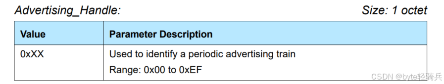 Advertising_Handle用于标识要配置的周期性广播实例的唯一句柄。这个句柄在蓝牙设备中是唯一的,用于控制器(通常是BLE芯片或模块)用来区分和管理不同广播集。当设备需要配置或管理多个周期性广播时,每个广播都会有一个唯一的Advertising_Handle。