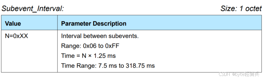 条件:该时间间隔应小于或等于广播集中周期性广播最小间隔(Periodic_Advertising_Interval_Min)除以广播集中子事件数量(Num_Subevents)的结果。