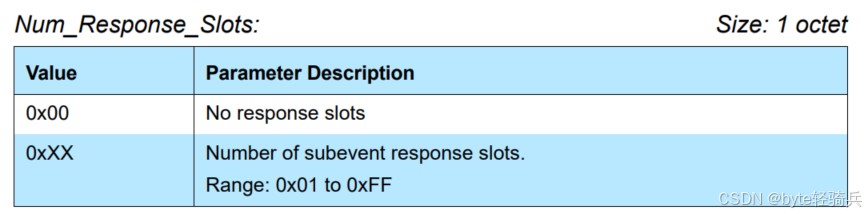 如果 Num_Response_Slots 设置为 0x00,则意味着广播者不希望接收任何响应,因此不需要配置响应插槽。在这种情况下,Response_Slot_Delay(响应插槽延迟)和 Response_Slot_Spacing(响应插槽间隔)参数就不再适用,因为它们与响应插槽的配置和使用直接相关。