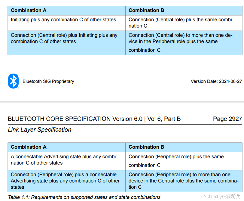 链路层实现不需要支持规范所允许的所有可能的状态组合。然而,如果它支持表 1.1 中 “组合 A” 列中给出的状态或状态组合,那么它也应该支持 “组合 B” 列中相应的状态或状态组合。