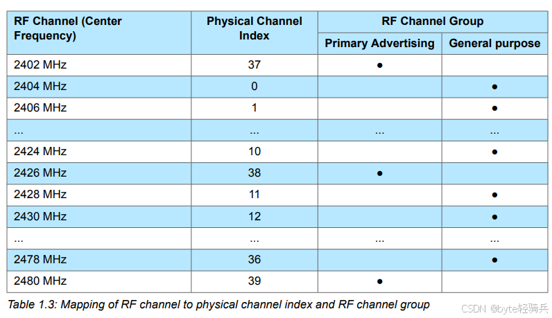 - 主要广播信道:包含3个RF信道(37,38和39),用于初始广播活动和所有传统广播活动。这些信道在设备发现、连接建立和广播数据等过程中起着关键作用。