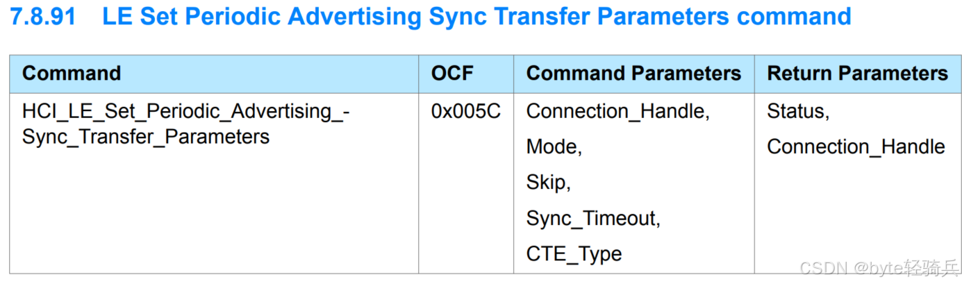 HCI_LE_Set_Periodic_Advertising_Sync_Transfer_Parameters 命令HCI_LE_Set_Periodic_Advertising_Sync_Transfer_Parameters 命令通常包含以下几个关键部分: