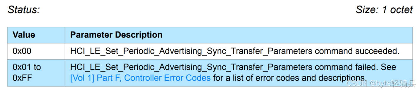 status参数主要用于指示HCI_LE_Set_Periodic_Advertising_Sync_Transfer_Parameters命令的执行结果。通过该参数的值,发送命令的主机设备可以快速了解到命令在控制器端的执行情况,以便做出相应的后续操作决策。