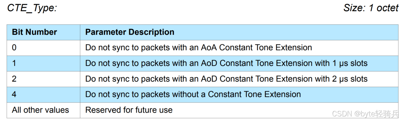 说明:当 CTE_Type 参数的值为 0(即所有位都被清零)时,表示恒定音调扩展(Constant Tone Extension,CTE)的存在与否对于同步操作是无关紧要的。也就是说,接收设备在进行同步判断时,不会因为数据包是否带有 CTE 或者带有何种类型的 CTE 而有所不同,会按照正常流程对周期性广播数据包进行同步处理,不做基于 CTE 类型的特殊区分。