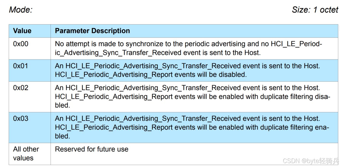 Mode 参数在接收周期性广播同步信息时起着决定性作用,并控制着蓝牙控制器与主机的交互方式以及周期性广播报告的启用状态和重复数据过滤功能。这是一种决策性的参数,直接影响着信息后续的处理路径。