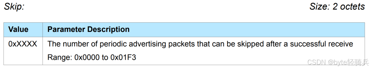 Skip 参数主要用于指定接收设备在成功接收一个周期性广播数据包之后,可以连续跳过的周期性广播数据包的数量。这样做有几个好处:
