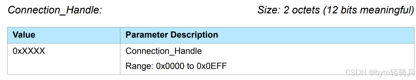 Connection_Handle通常为一个整数类型。Connection_Handle的取值范围在0x0000至0x0EFF之间(对应十进制0至239)。Connection_Handle的取值范围可能仅限于0至7(假设编号从0起始)。连接句柄验证:如果