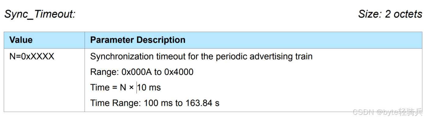 Sync_Timeout参数确保接收方能够持续且可靠地接收周期性广播包。如果由于某种原因(如信号干扰、设备移动等)导致接收方在指定的时间间隔内未能成功接收到广播包,Sync_Timeout将触发同步丢失的机制。