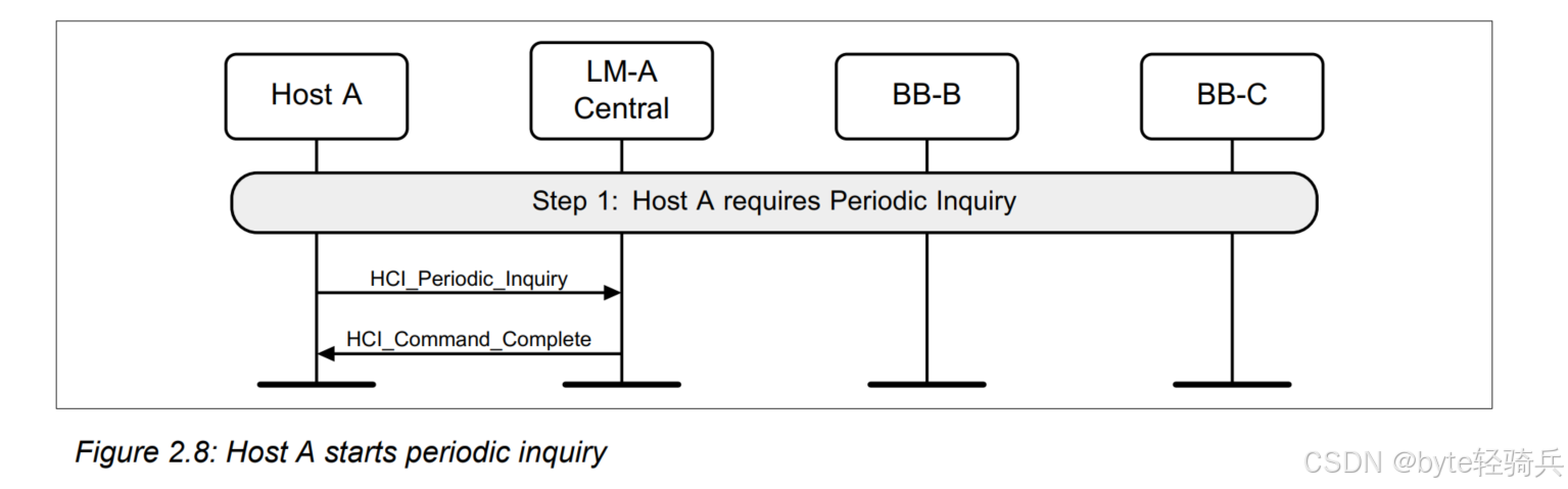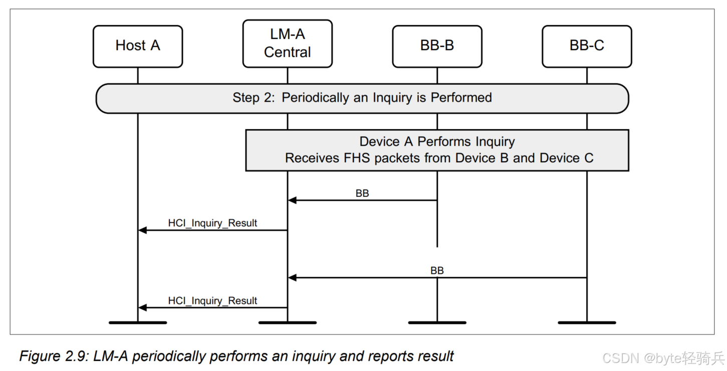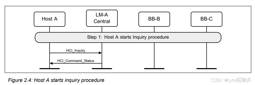 在这一步中,主机(即执行查询的设备)通过其蓝牙控制器接口(HCI)发送一个 HCI_Inquiry 命令。这个命令包含了查询的一些参数,如查询的持续时间、需要返回的响应数量(即最大设备数)、以及是否请求远程设备的名称等。