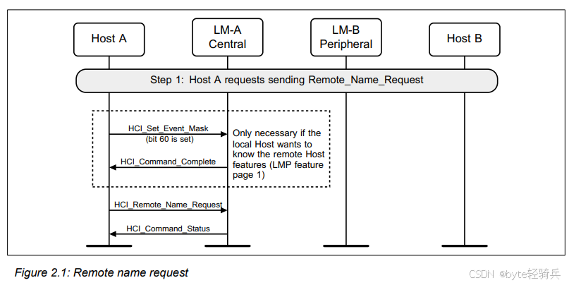 主机发送一个 “主机控制器接口设置事件掩码”(HCI_Set_Event_Mask)命令,将 “远程主机支持特性通知事件”(Remote Host Supported Features Notification event)对应的位(第 60 位)置位,同时发送一个 “主机控制器接口远程名称请求”(HCI_Remote_Name_Request)命令,期望其本地设备会自动尝试连接到远程设备。【0x0001】HCI_Set_Event_Mask详解-CSDN博客
