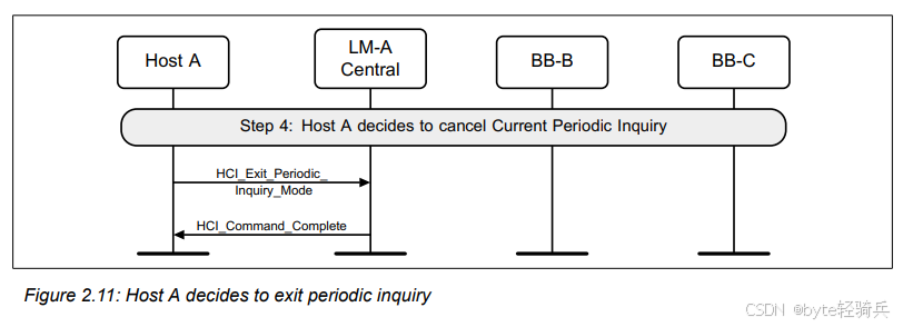 如果主机希望停止周期性查询,可以发送HCI_Exit_Periodic_Inquiry_Mode命令给蓝牙控制器。一旦接收到此命令,控制器将停止当前的周期性查询模式,并准备接收其他命令。
