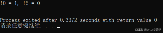 printf("!%d = %d, !%d = %d\n", a, result_a, b, result_b); // 输出!0 = 1, !5 = 0
