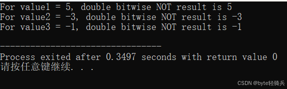 printf("For value3 = %d, double bitwise NOT result is %d\n", value3, result3);