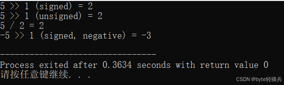 int signed_result = signed_a >> 1; // 右移1位,结果为2(二进制0010)