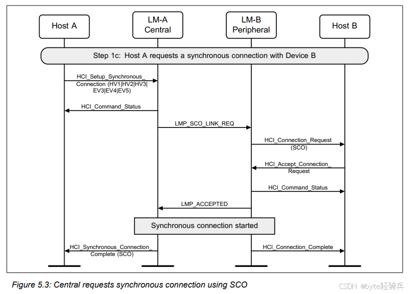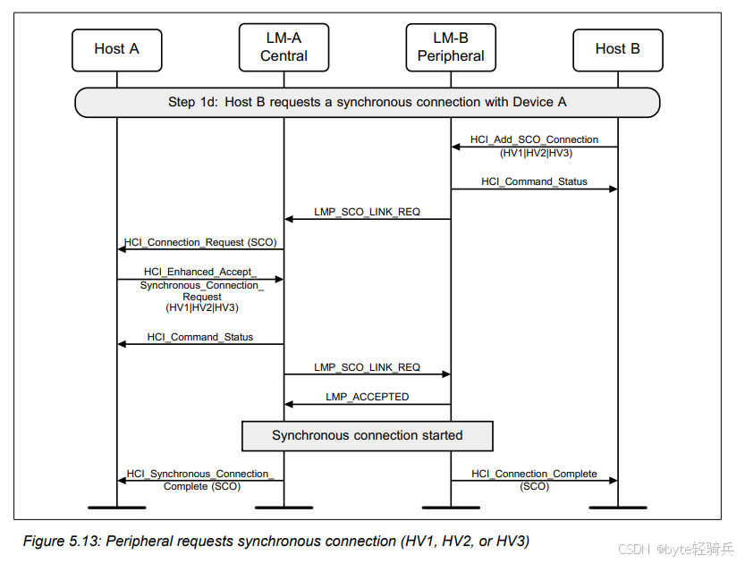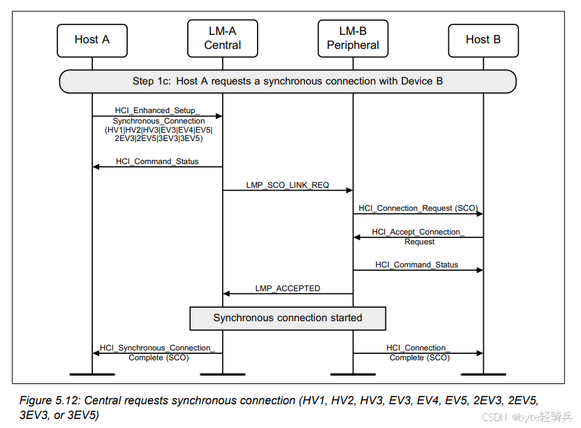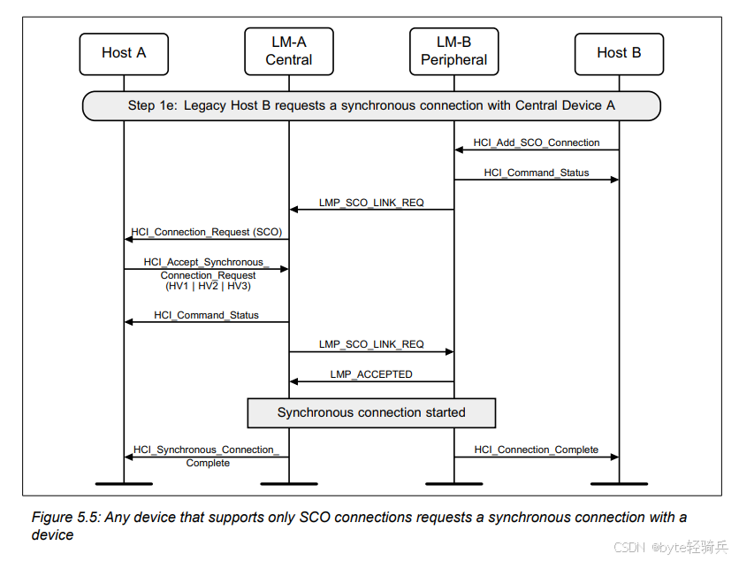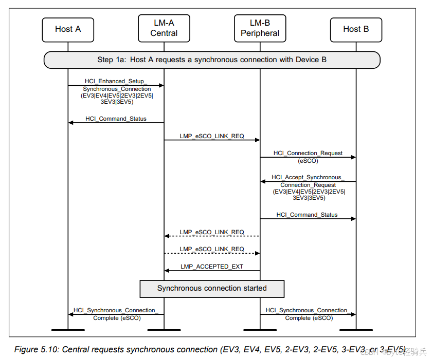 LMP_SCO_LINK_REQ(再次发送) :Device A 这边会再次通过链路管理协议发送 LMP_SCO_LINK_REQ 消息。这一次的发送主要是为了在链路层面进一步巩固和确认建立 SCO 连接的请求,让链路两端都再次明确要建立这一连接的意向,强化双方在链路层面对于建立连接这件事的共识,避免可能出现的误解或者因链路状态变化等原因导致连接建立失败的问题,确保链路层面对连接建立的一致性和稳定性。LMP_ACCEPTED :当 Host B 所在链路一侧接收到 Device A 再次发来的 LMP_SCO_LINK_REQ 消息后,如果经过检查确认无误,就会回复 LMP_ACCEPTED 消息,表示接受来自 Central Device A 的链路请求。至此,双方在链路层面正式达成一致,同意建立 SCO 连接,这就如同双方在链路这条 “信息通道” 上签订了一份建立连接的正式协议,为后续真正构建起可用的同步连接提供了坚实的链路层面的保障。 Initiation of Synchronous Connection(同步连接的启动): 在双方通过链路管理协议达成一致,也就是收到 LMP_ACCEPTED 消息后,实际的 SCO 同步连接就会正式启动。此时,就好比在 Host B 和 Central Device A 之间成功打通了一条专门用于按照固定时间间隔、有序且实时地传输数据的 “高速公路”,后续它们便可以依据预先设定好的规则和配置,开始进行诸如语音通话之类的实时数据传输活动了,标志着连接已经从协商阶段进入到实际可用的阶段。