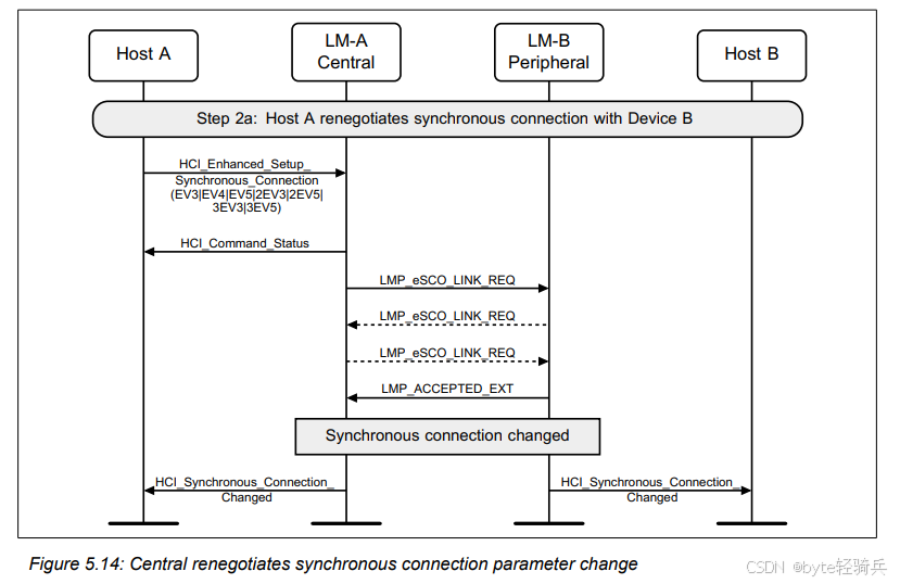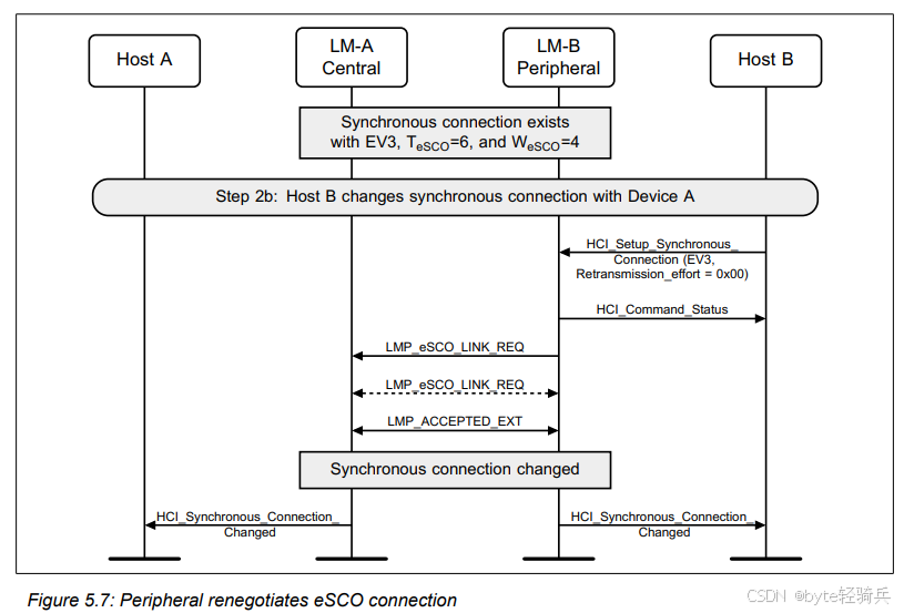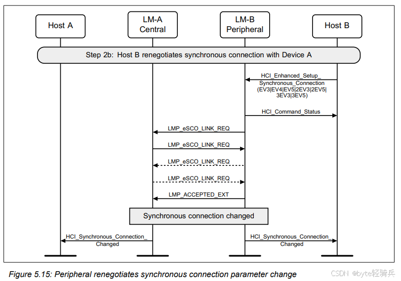 2.2.2. Step 2b :Peripheral renegotiates eSCO connection同样地,外围设备也可能主动重新协商eSCO连接。这与中心设备的操作目的类似,都是为了优化连接性能,只不过发起者是外围设备。