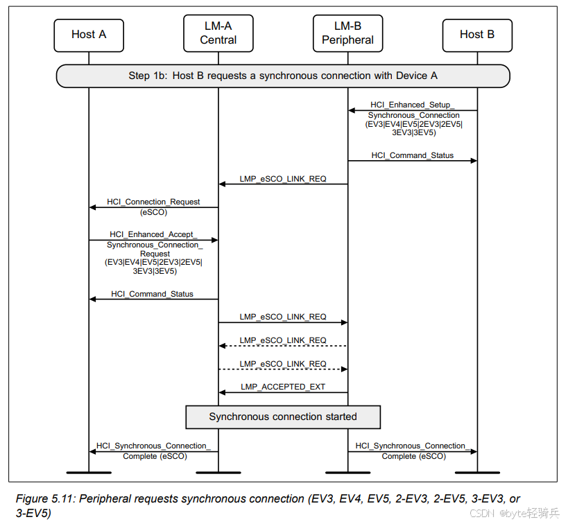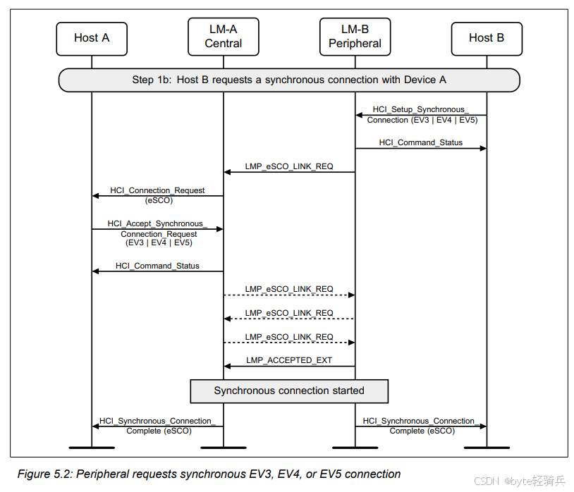 Host A 发送请求 :Host A(作为中央设备)通过HCI发送一个HCI_Enhanced_Setup_Synchronous_Connection 命令给其蓝牙控制器,以请求与Device B(由Host B托管)建立同步连接。此命令可能包含多个参数,如连接类型(EV3、EV4、EV5等,这些代表不同的蓝牙核心规范版本和特性集)、数据包大小、重传参数等。HCI 命令状态 :蓝牙控制器会返回一个HCI_Command_Status事件,以确认是否成功接收到该命令。LMP eSCO 链路请求 :如果命令成功接收,蓝牙控制器会通过链路层协议(LMP)发送一个LMP_eSCO_LINK_REQ消息给Device B的蓝牙控制器,以请求建立eSCO链路。Device B 响应 :Device B的蓝牙控制器接收到LMP_eSCO_LINK_REQ后,会通过Device B的链路管理器(LM-B)发送一个HCI_Connection_Request(eSCO)给其Host,以确认接受同步连接请求。如果经过自身的相关判断和处理,确认可以接受这一同步连接请求,就会通过 HCI 回复 HCI_Accept_Synchronous_Connection_Request (EV3|EV4|EV5|2EV3|2EV5|3EV3|3EV5) 消息,并且回复中同样携带了 (EV3|EV4|EV5|2EV3|2EV5|3EV3|3EV5) 参数。这意味着 Device B 在同意建立连接的同时,也认可了 Host A 提出的关于连接的那些特定设置要求,双方在连接建立的关键细节(也就是由 EV3、EV4、EV5、2EV3、2EV5、3EV3、3EV5 所代表的相关参数方面)达成了初步的一致意见,为后续链路层面的进一步确认和连接的最终建立奠定了良好的基础,就好像双方在连接的具体技术规格上达成了初步共识,接下来可以继续推进在链路层面的具体协商与确认工作。命令状态反馈: 同样,在 Device B 发出 HCI_Accept_Synchronous_Connection_Request 消息后,Device B会返回 HCI_Command_Status 信息给 HostB,告知它所发出的接受请求的命令已被系统正确接收并在按流程处理,确保整个交互过程的连贯性和准确性,使双方都能明确各自操作的执行情况。LMP_eSCO_LINK_REQ(链路管理协议 eSCO 链路请求,再次发送): 然后,Device B 这边会再次通过链路管理协议发送 LMP_eSCO_LINK_REQ 消息,强化链路层面的沟通效果,保障连接建立流程能顺利进行下去。同步连接建立 :一旦双方蓝牙控制器都确认了连接请求,它们将开始建立eSCO链路。完成后,Host A和Host B的蓝牙控制器都会发送一个HCI_Synchronous_Connection_Complete事件,以通知各自的主机同步连接已成功建立。3.1.2. 步骤 1b:外围设备请求eSCO连接 同样,外围设备也可以向中央设备发起建立同步连接的请求。