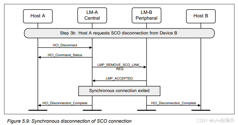 2.3.2. Step 3b :SCO disconnection在eSCO连接断开后,如果SCO连接仍然存在(在某些情况下,eSCO连接可能是在SCO连接的基础上建立的),则还需要单独断开SCO连接。SCO 连接断开与 eSCO 连接断开类似,也是在相应的通信任务完成或者出现异常情况后进行的操作。