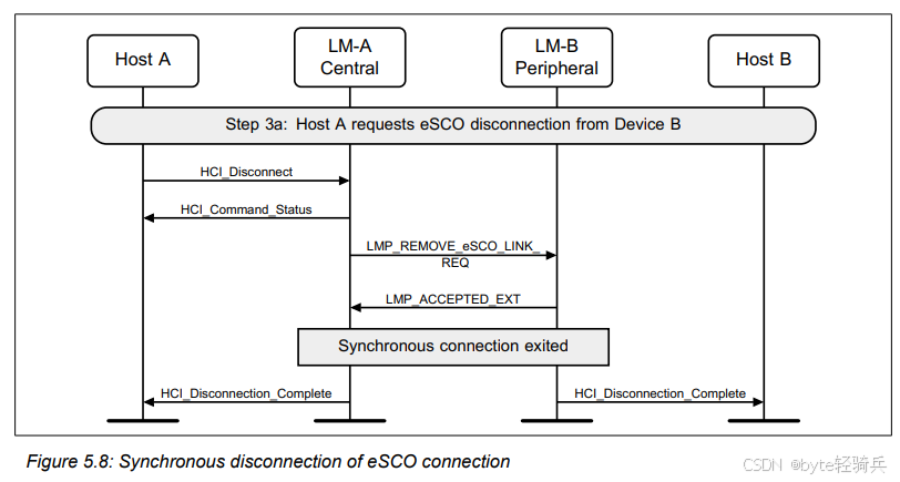 2.3. 同步连接断开 2.3.1. Step 3a :eSCO disconnection当不再需要eSCO连接时或者出现了某些异常情况使得连接无法继续维持的时候,中央设备或外围设备可以发起eSCO连接的断开请求。通常涉及发送一个断开命令(HCI_Disconnect),并等待对方的确认。