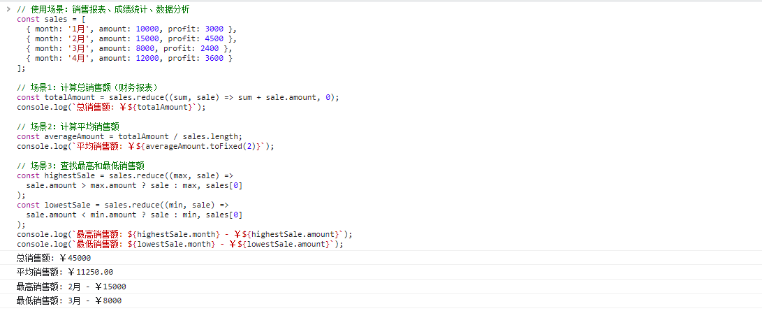 console.log(`平均销售额: ¥${averageAmount.toFixed(2)}`);