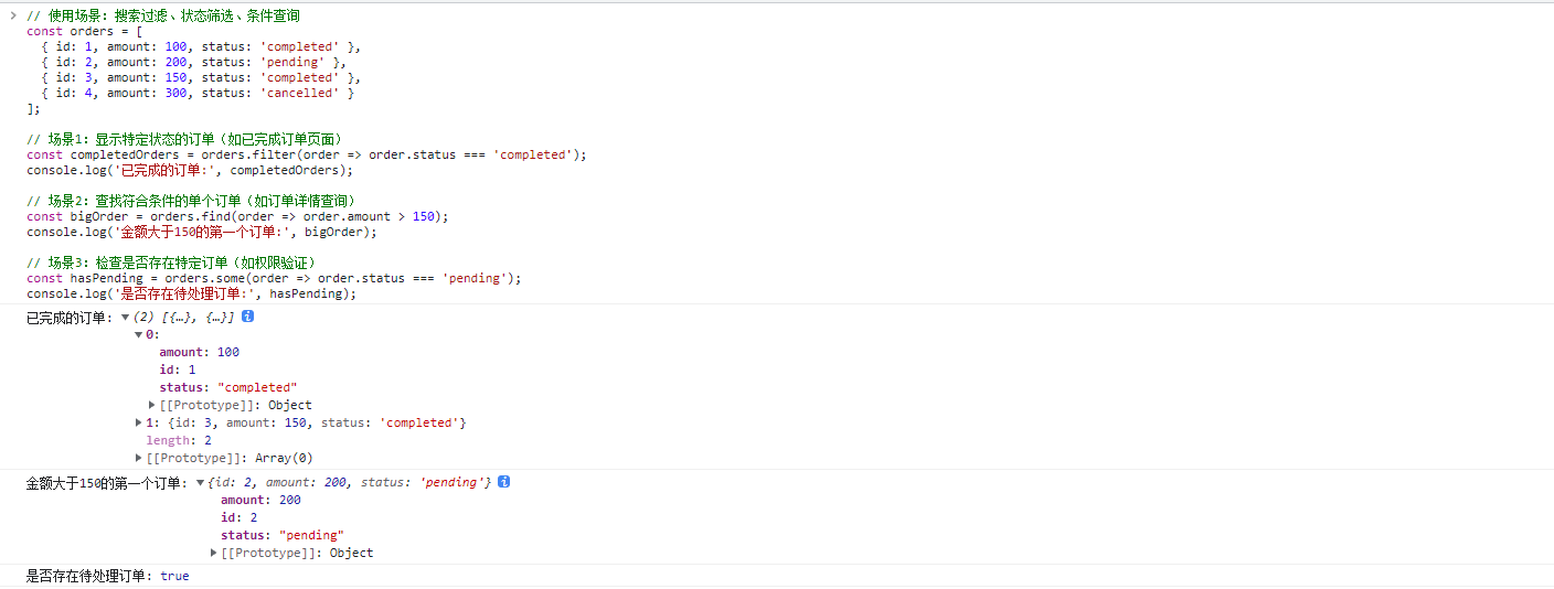 console.log('是否存在待处理订单:', hasPending);说明:filter返回所有匹配项,find只返回第一个匹配项,some用于验证存在性。