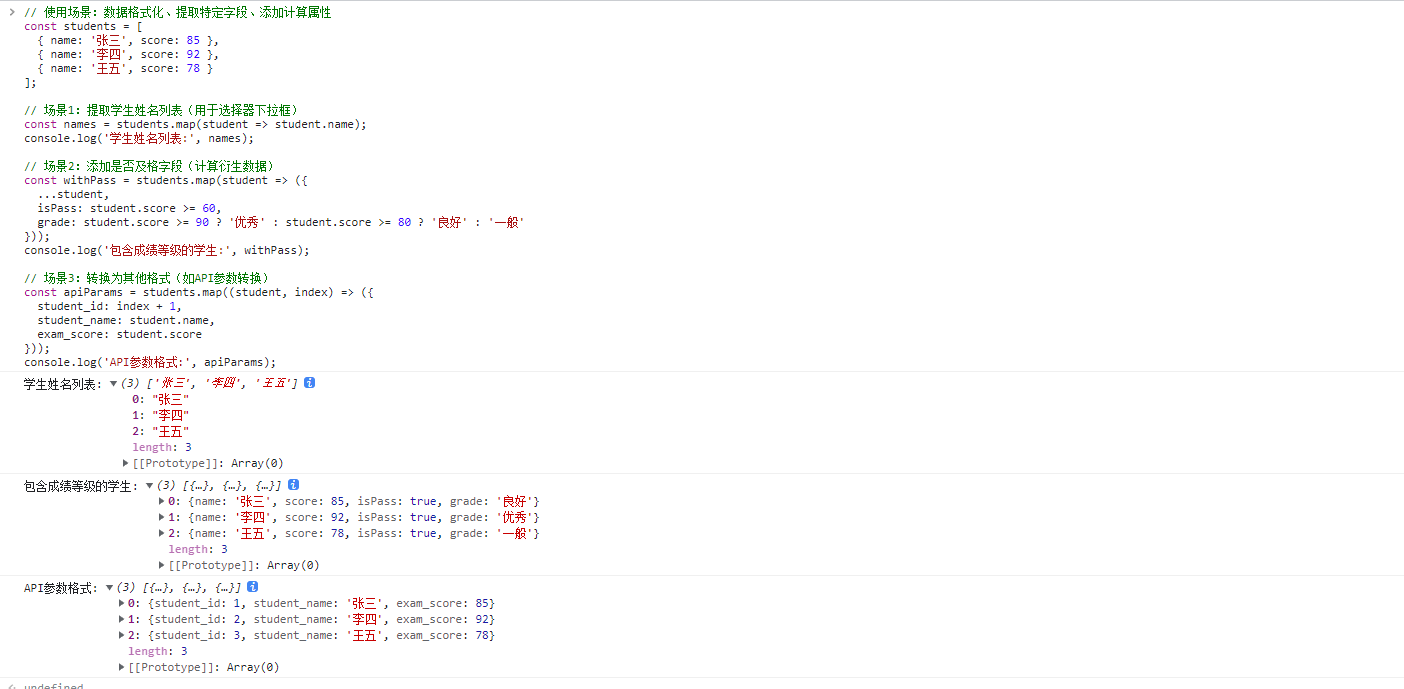 说明:map方法创建新数组而不修改原数据,非常适合数据转换场景。