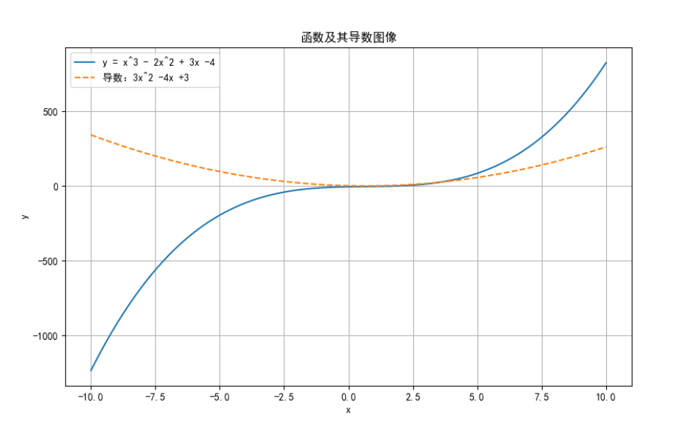 计算函数 y = x^3 - 2x^2 + 3x - 4 的导数,并绘制函数图像及其导数图像。