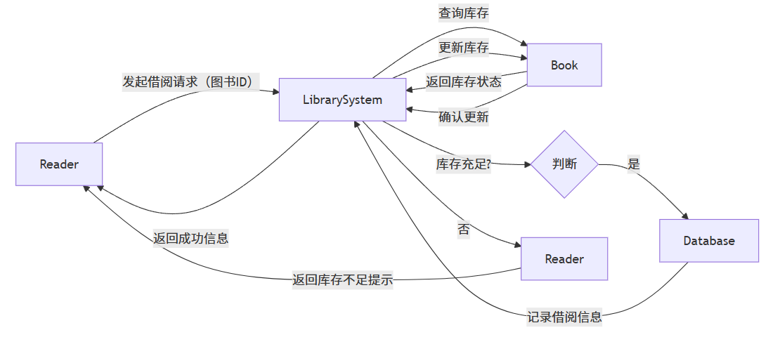 }分析类之间通过方法调用实现协作。例如,Reader 类通过调用 Book 类的 borrowBook 方法实现图书借阅,同时创建 BorrowRecord 记录借阅信息。
