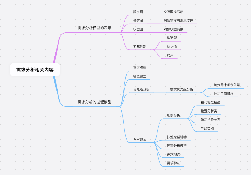 为了更清晰呈现本章知识结构,可通过思维导图梳理需求分析模型相关要点,涵盖从表示方法到验证的全流程,帮助读者构建系统化认知框架。