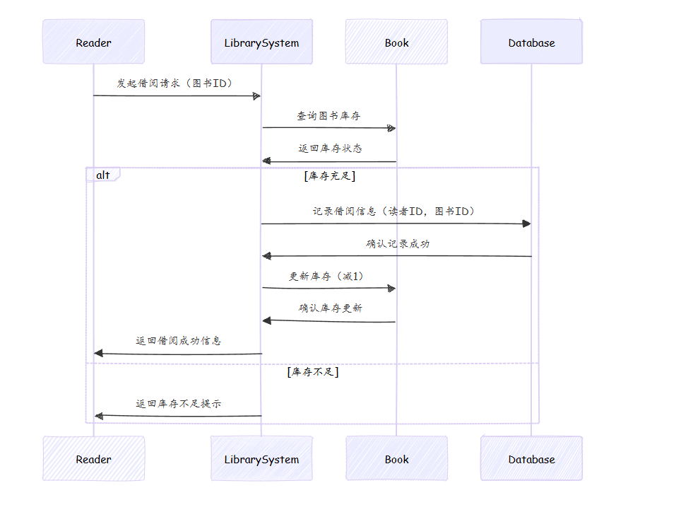 以在线图书借阅系统的 “图书借阅” 流程为例,顺序图如下: