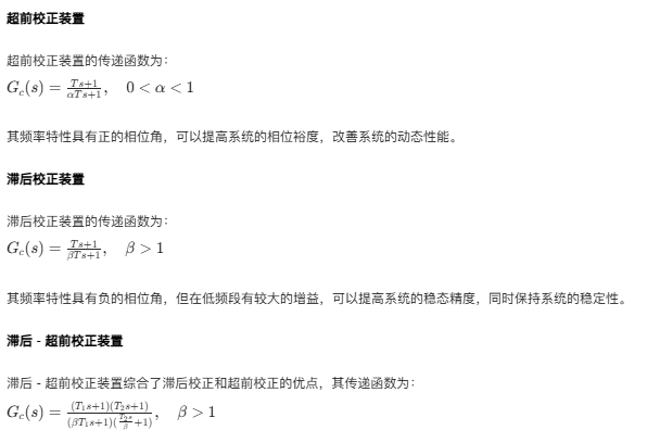 常用的校正装置包括超前校正装置、滞后校正装置和滞后 - 超前校正装置。这些校正装置可以通过改变系统的频率特性来改善系统的性能。
