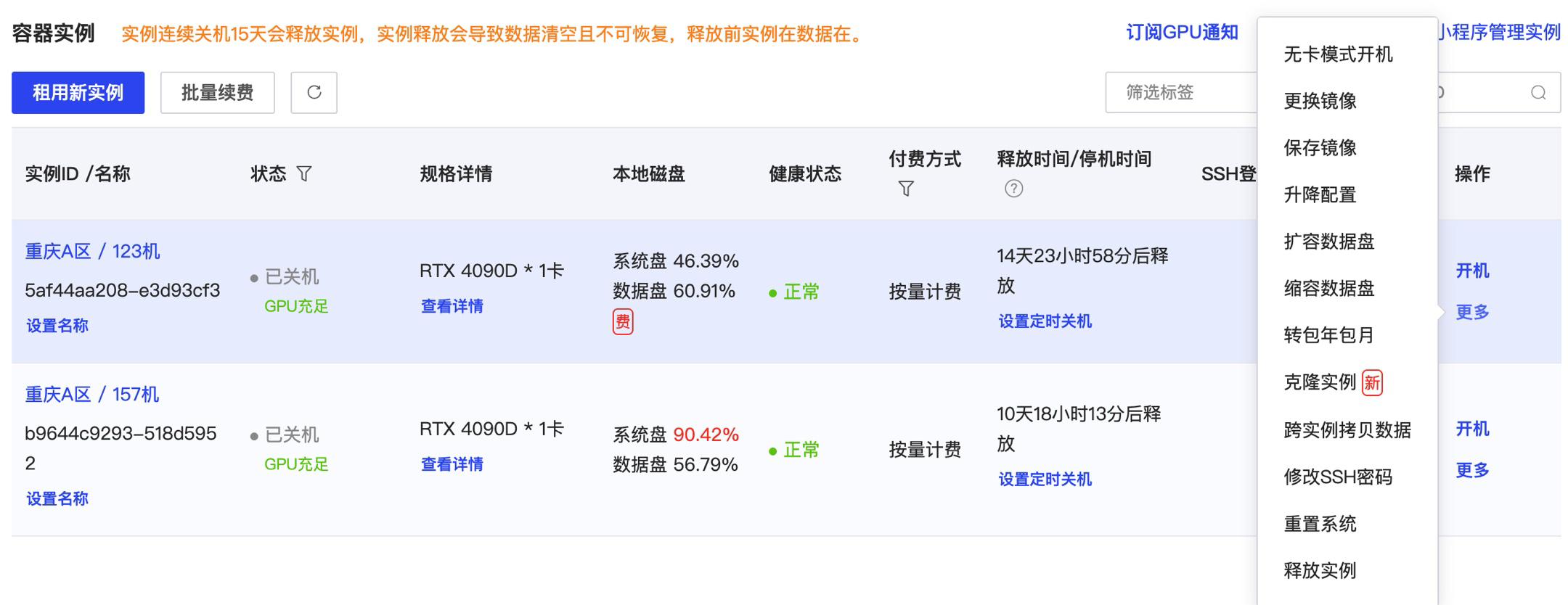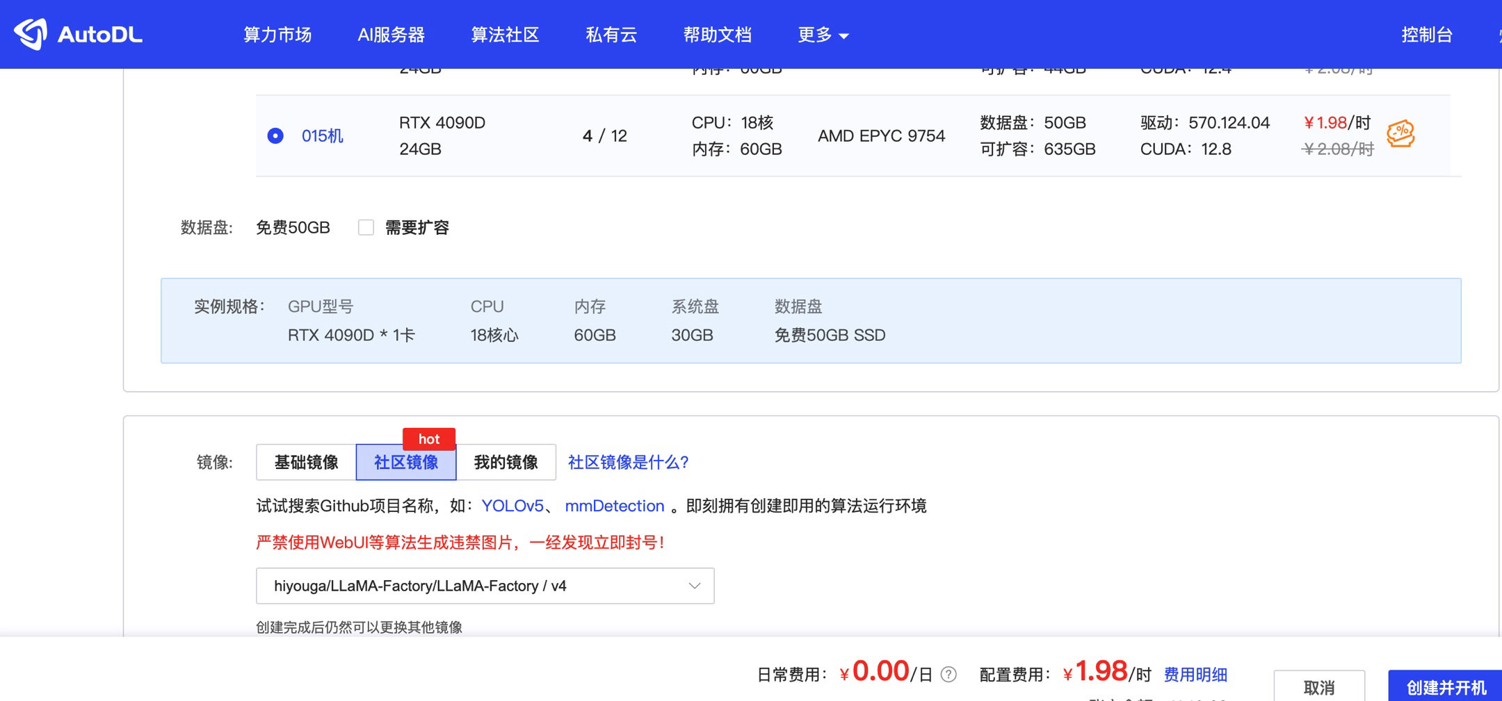 如下截图,选择租用了RTX 4090D的显卡,主机的cpu和内存配置也都还不错,数据盘默认是50G,有需要的话可以额外付费扩容。
