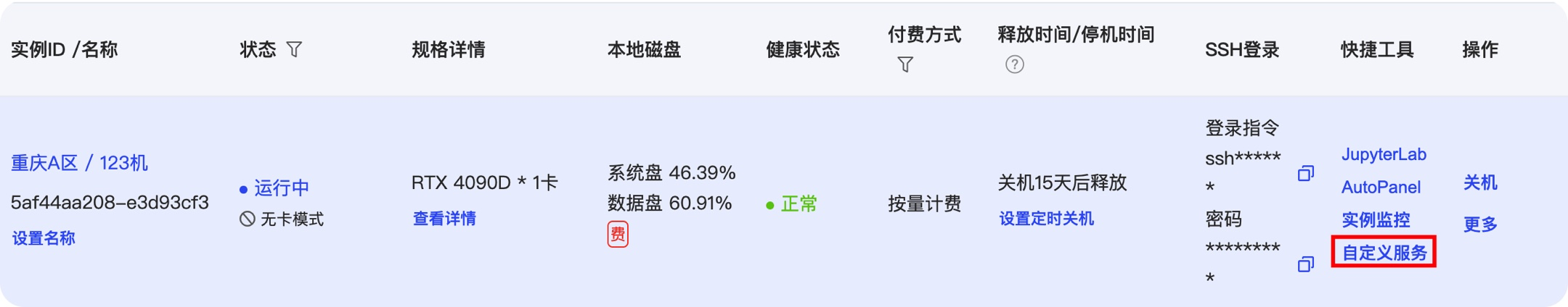 然后到AutoDL实例页面选择“自定义服务”
