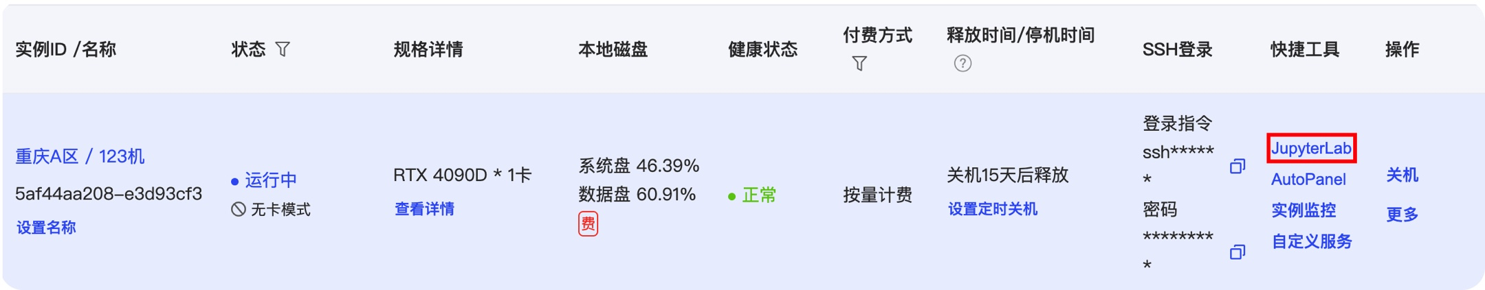 我训练的时候由于存储微调后的模型文件需要转存成不同量化的版本,所以扩容了50G,一天只需要不到0.4元。创建实例开机后,就可以开始配置了。